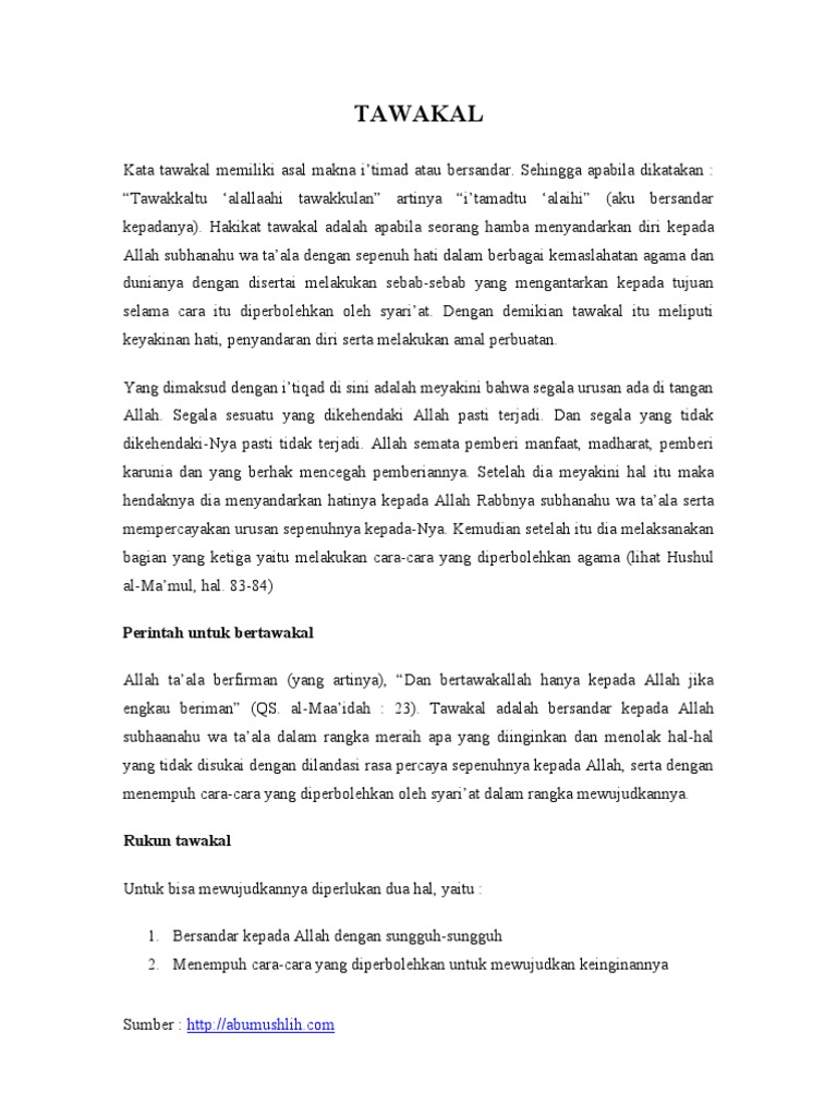 Tawakal Artinya Adalah - Doc Tawakal Al Tawakkul Wini Allika Academia Edu : Tawakal adalah sebab yang paling utama yang bisa hal ini berdasarkan hadits shohih berikut ini (yg artinya):. Tawakal adalah sebab yang paling utama yang bisa hal ini berdasarkan hadits shohih berikut ini (yg artinya): Tawakal merupakan aktivias hati, artinya tawakal itu merupakan perbuatan yang dilakukan oleh derajat pertama dari tawakal adalah : Bahkan, sebagaimana disebutkan dalam sebuah hadits yang masyhur, tawakal adalah salah satu sifat orang yang masuk. Kita harus bersyukur dan ketika mendapatkan musibat kita harus bersabar dan tawakal. توكُÙ„) atau tawakkul berarti mewakilkan atau menyerahkan.